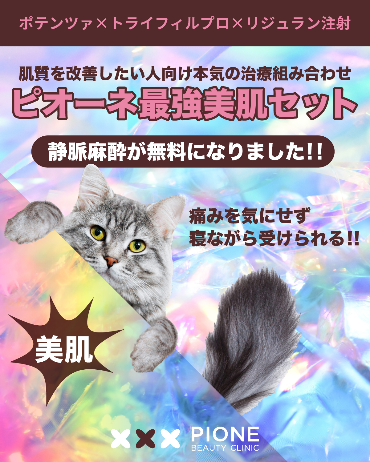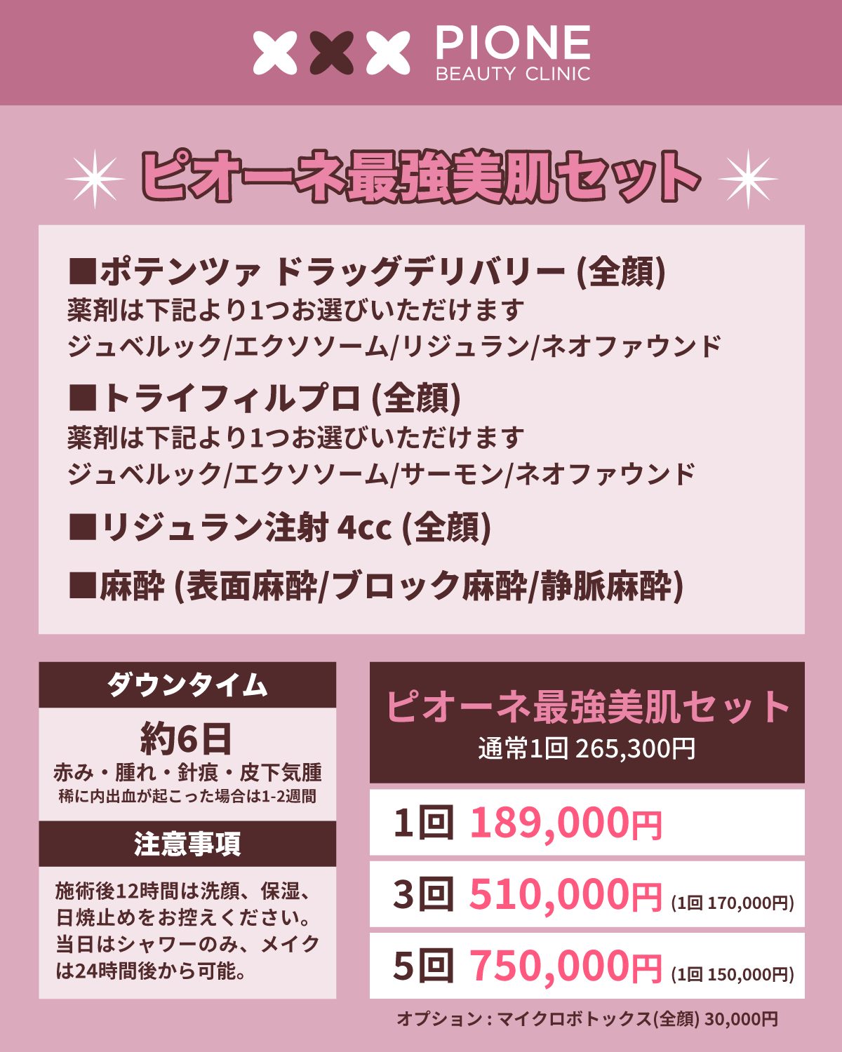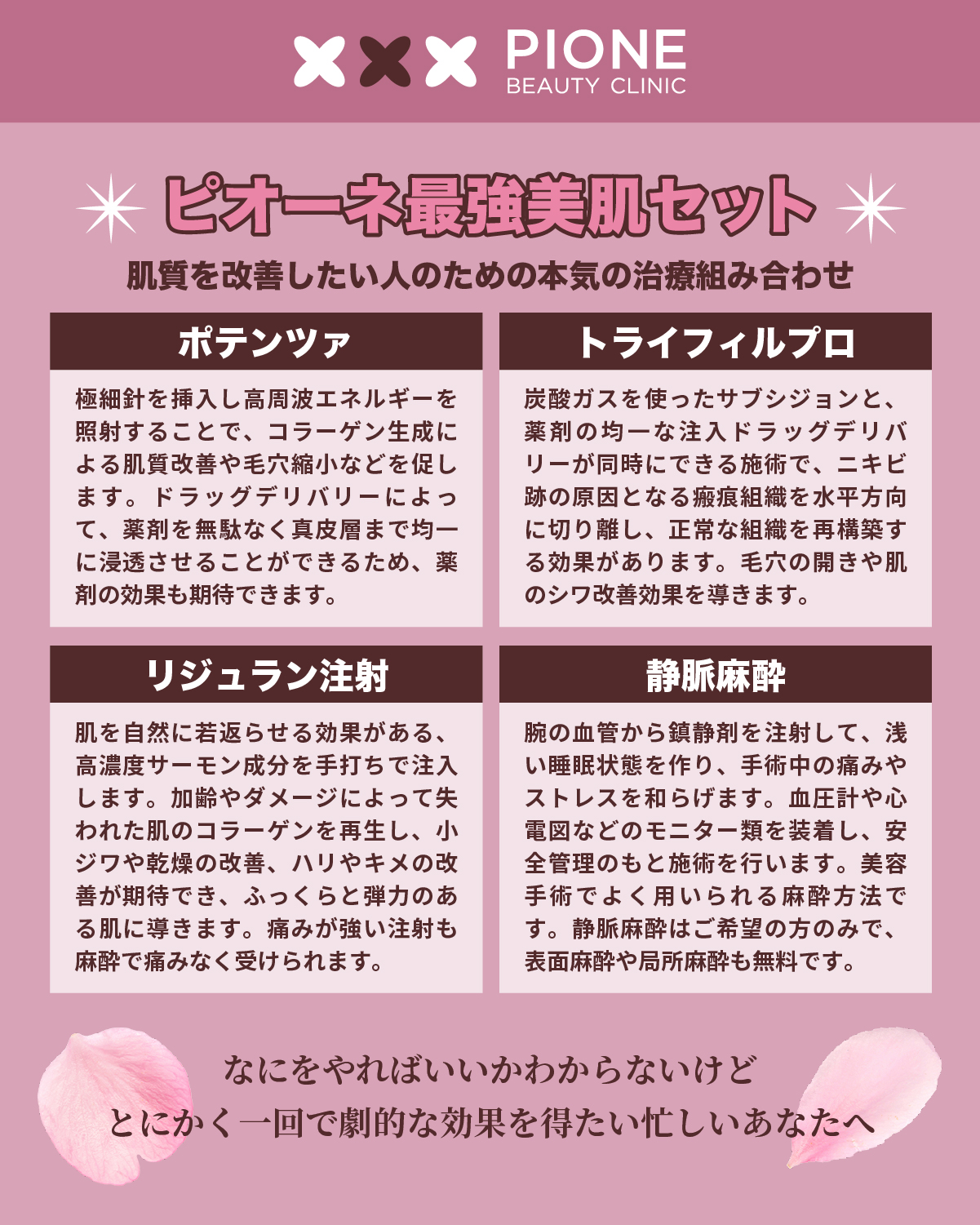 YouTuberのヒカルさんにも現在受けていただいている『ピオーネ最強美肌セット』は、お肌にお悩みの方、何をやればいいか分からないけどとにかく1回で劇的な変化を求める方にお勧めの当院最上級の美肌治療です。