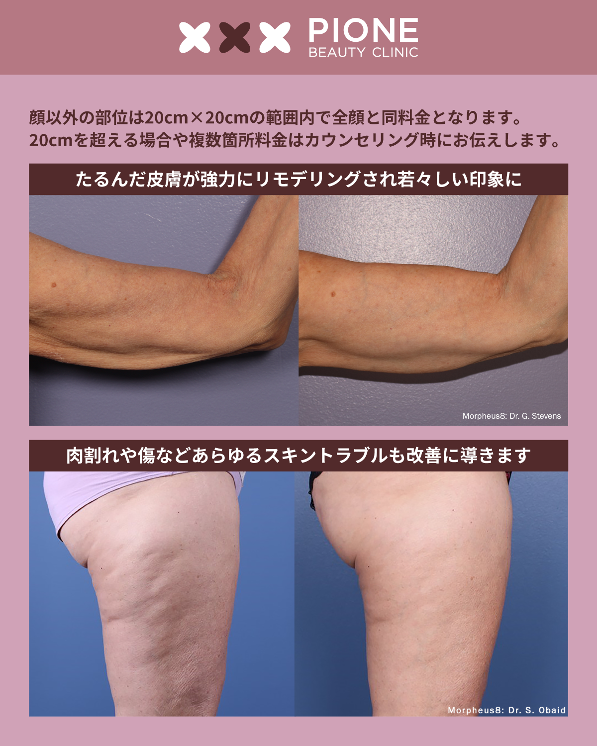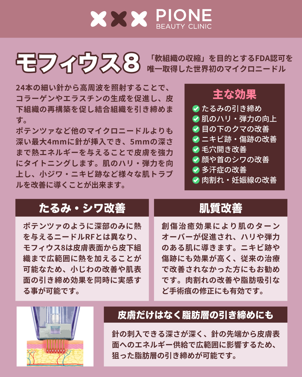 ポテンツァより深く高エネルギーを照射して、肌を強力に引き締めながら、ニキビ跡や毛穴や傷跡などスキントラブルの改善に導きます。トータルの若返り治療として大変効果的な治療です。