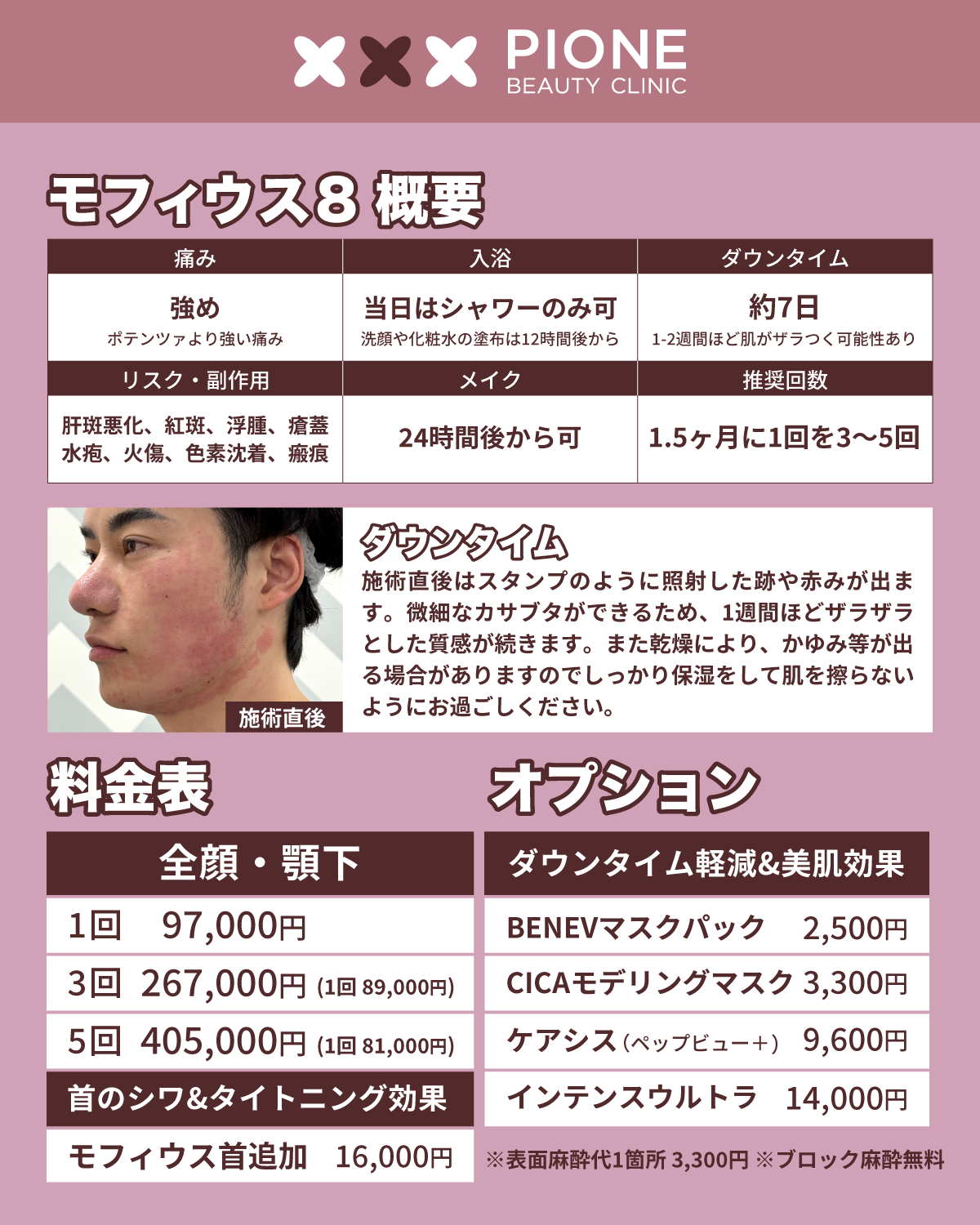 ダウンタイムは1週間ほど細かいカサブタが出来るためお肌がザラザラします。ダウンタイム軽減にインテンスウルトラとセットでお受けいただく事を推奨しています。