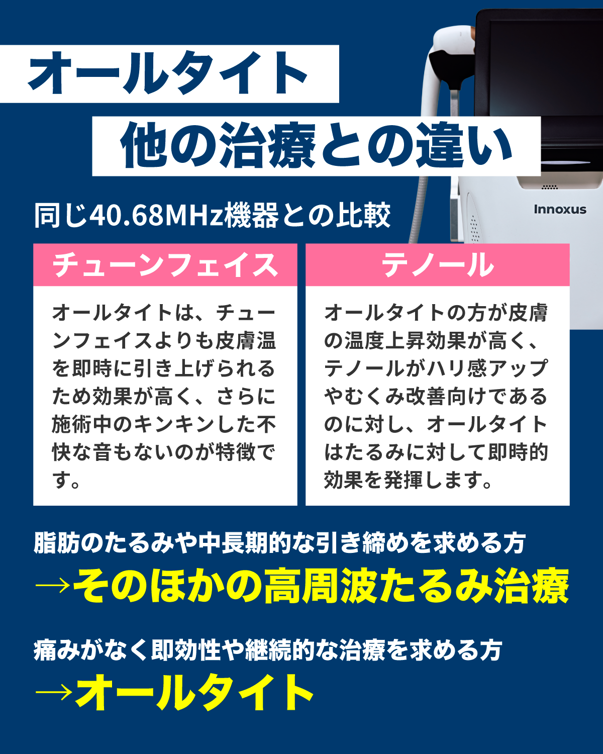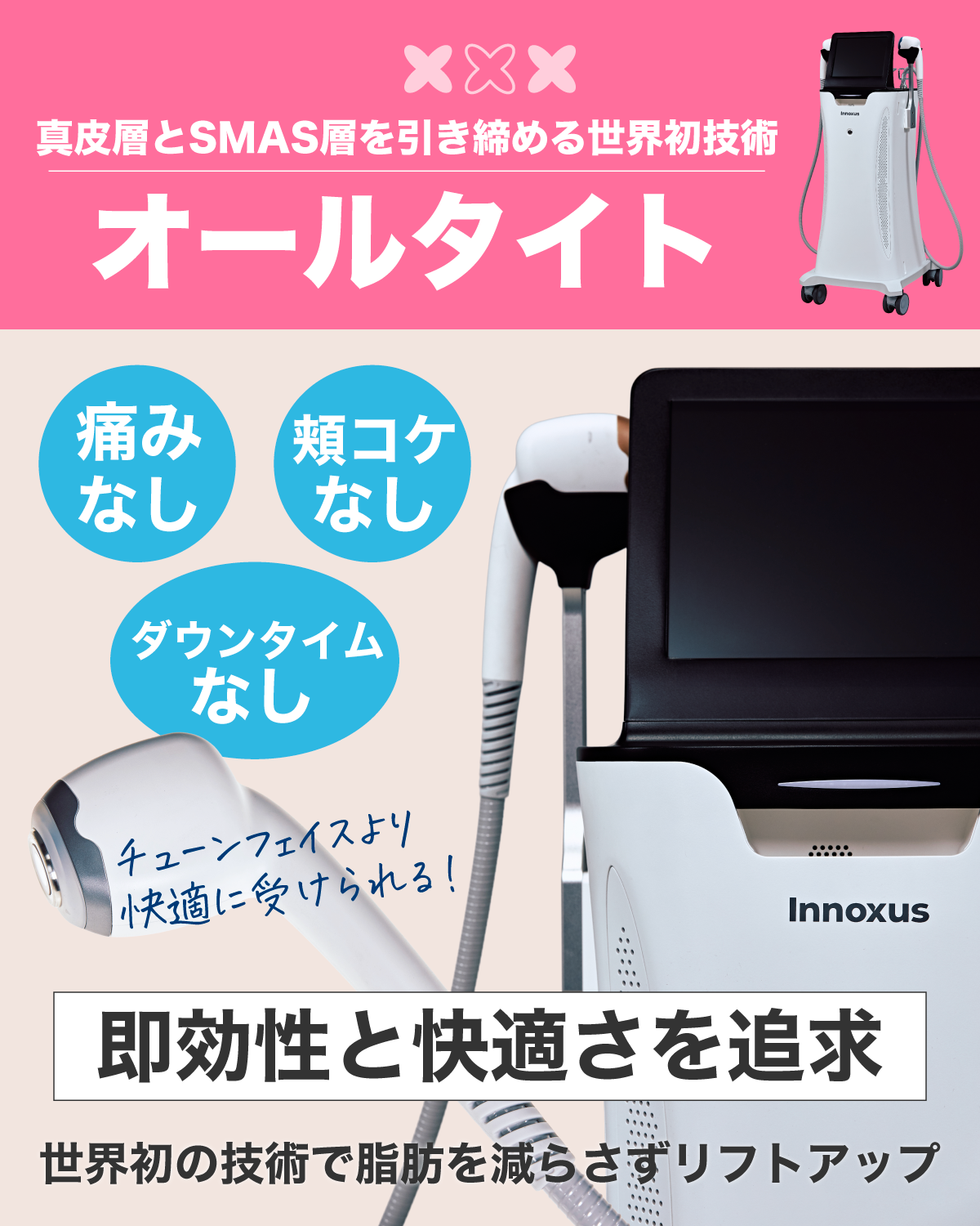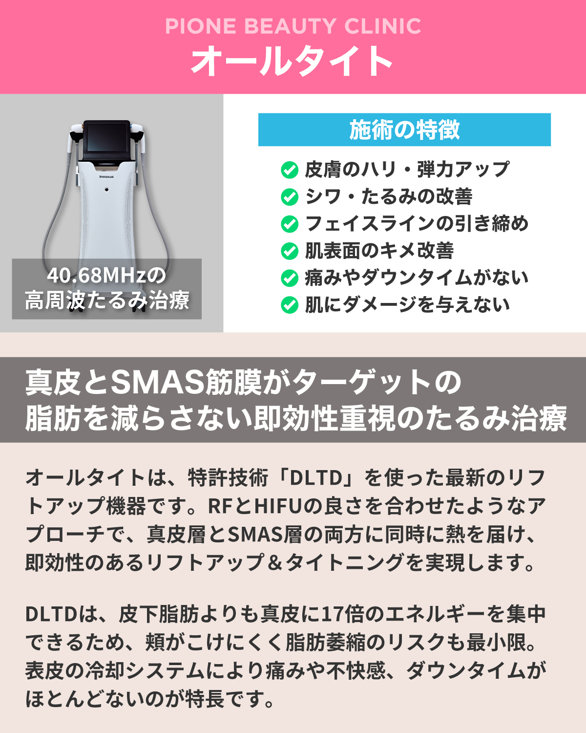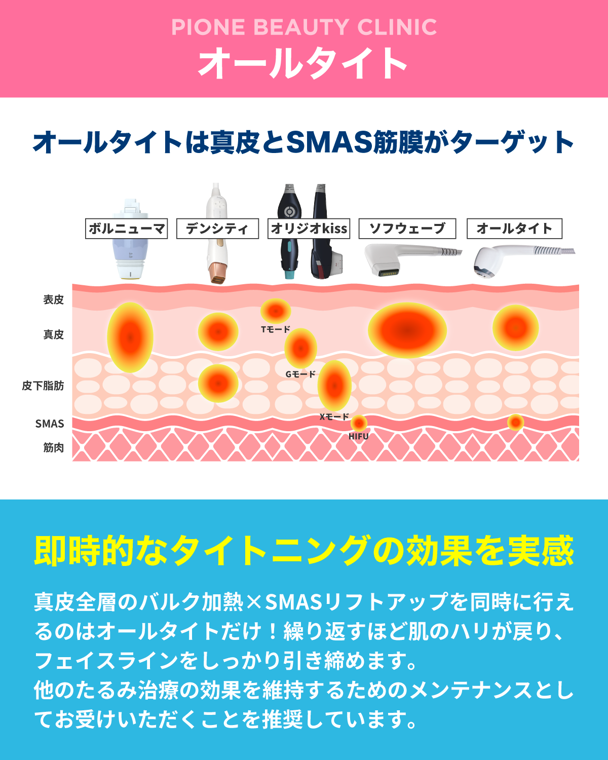 即効性のあるたるみ治療で、他のたるみ施術のメンテナンスや継続的な治療としておすすめの『オールタイト』を導入しました。