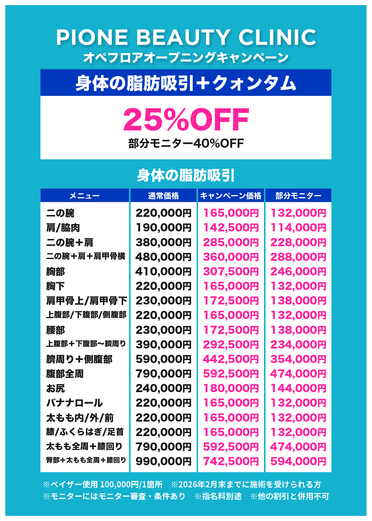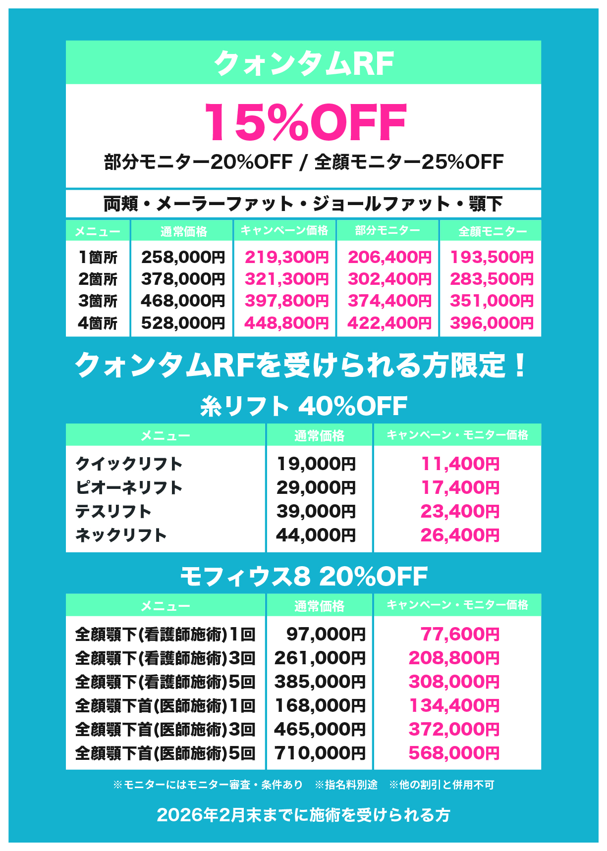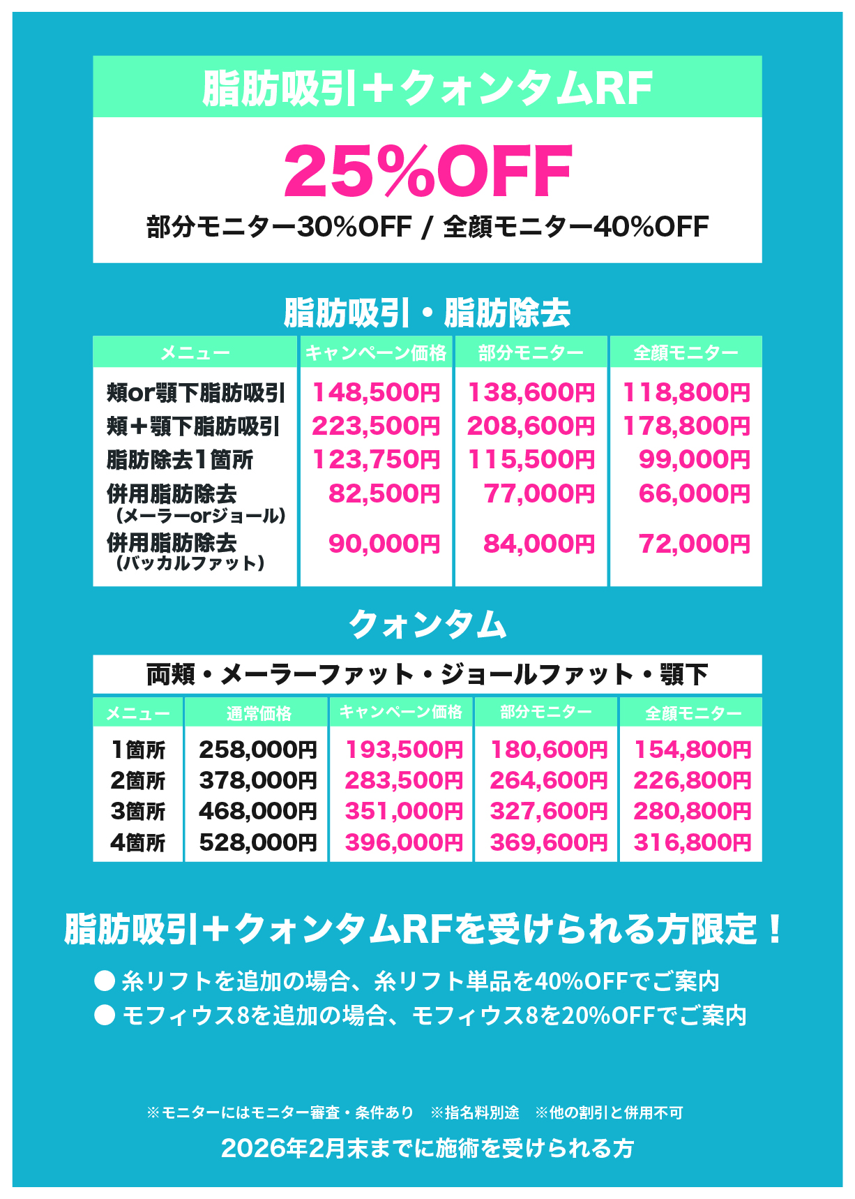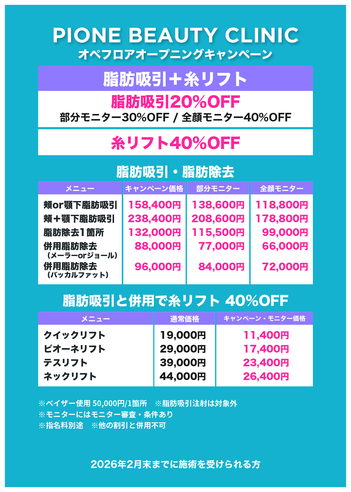 ※糸リフトのみの施術の場合のキャンペーンはありませんが、『デラウェアセット』などお得なセットメニューのご用意や、脂肪吸引やクォンタムとの併用でしたらキャンペーンが適用となります。